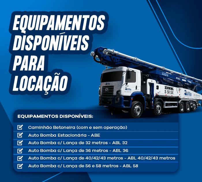 Somos referência na locação e venda de equipamentos para transporte, bombeamento e lançamento de concreto, atuando com excelência em todo o Brasil. Oferecemos uma frota moderna e confiável de caminhões betoneira, bombas de concreto, incluindo bombas lança e bombas estacionárias, atendendo obras de todos os portes com agilidade, segurança e suporte técnico especializado.